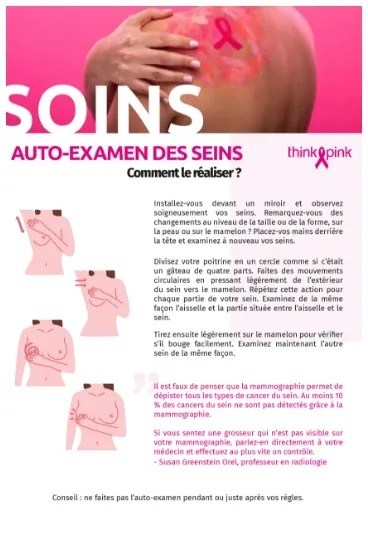 Think Pink vous encourage à consulter et à découvrir le guide de l’autopalpation, pour mieux connaître et repérer les premiers signes du cancer du sein.