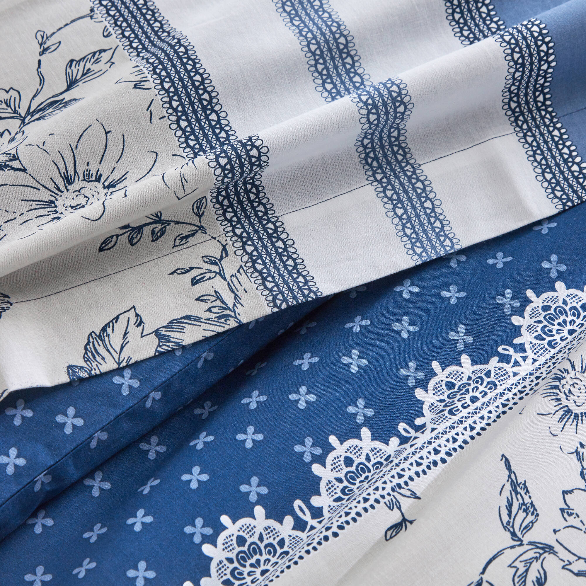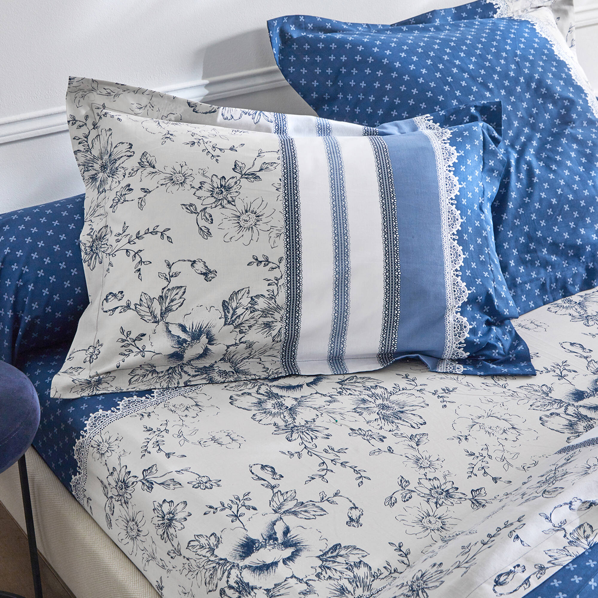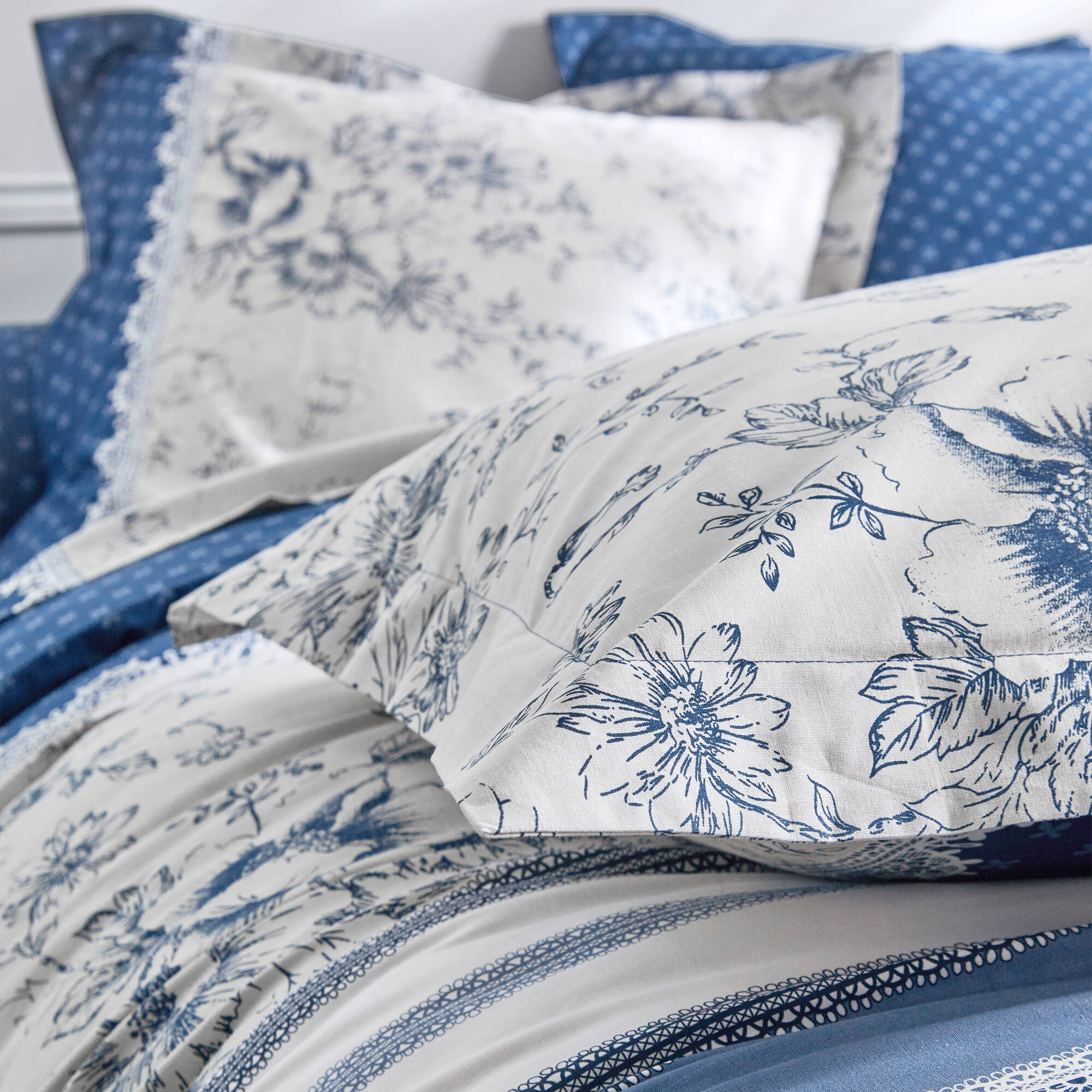 Linge de lit Gabrielle en coton imprimé pois, fleurs et dentelle (bleu marine)