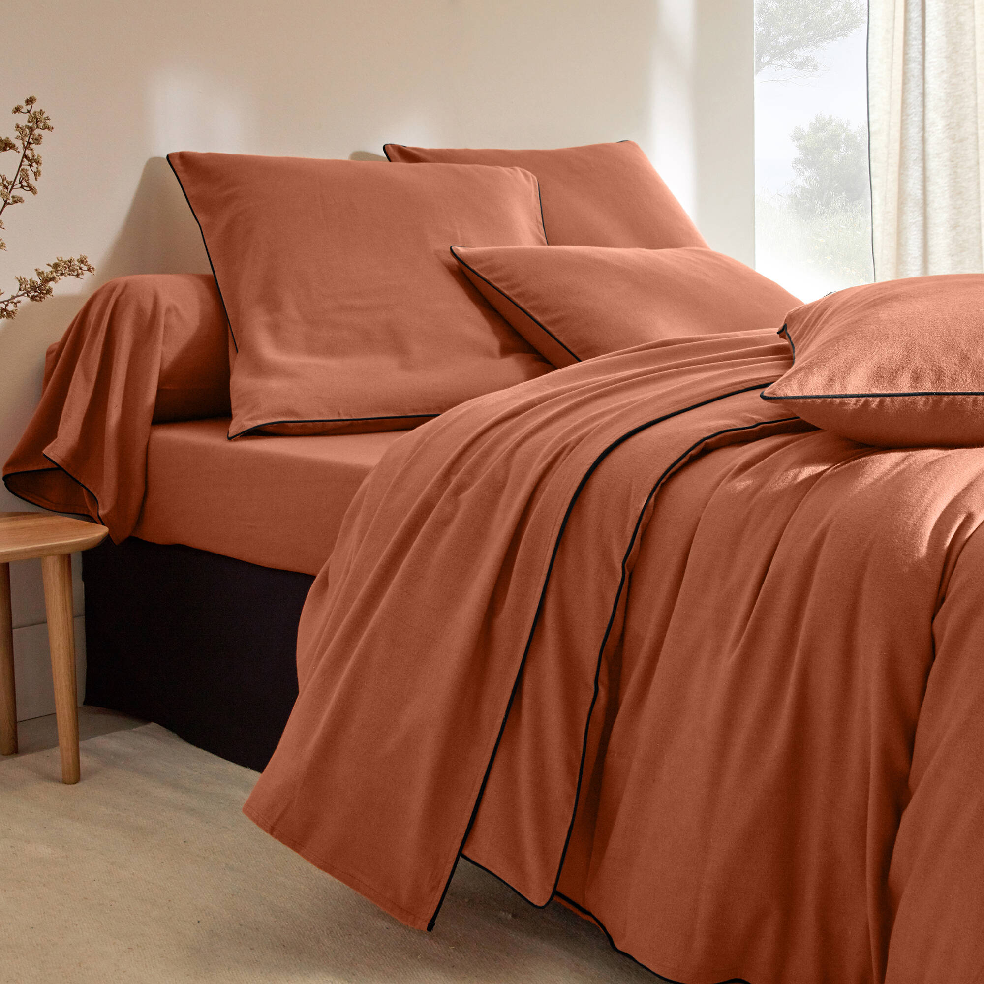 Linge de lit uni flanelle passepoil contrasté, collection "Intemporelle" (tomette)