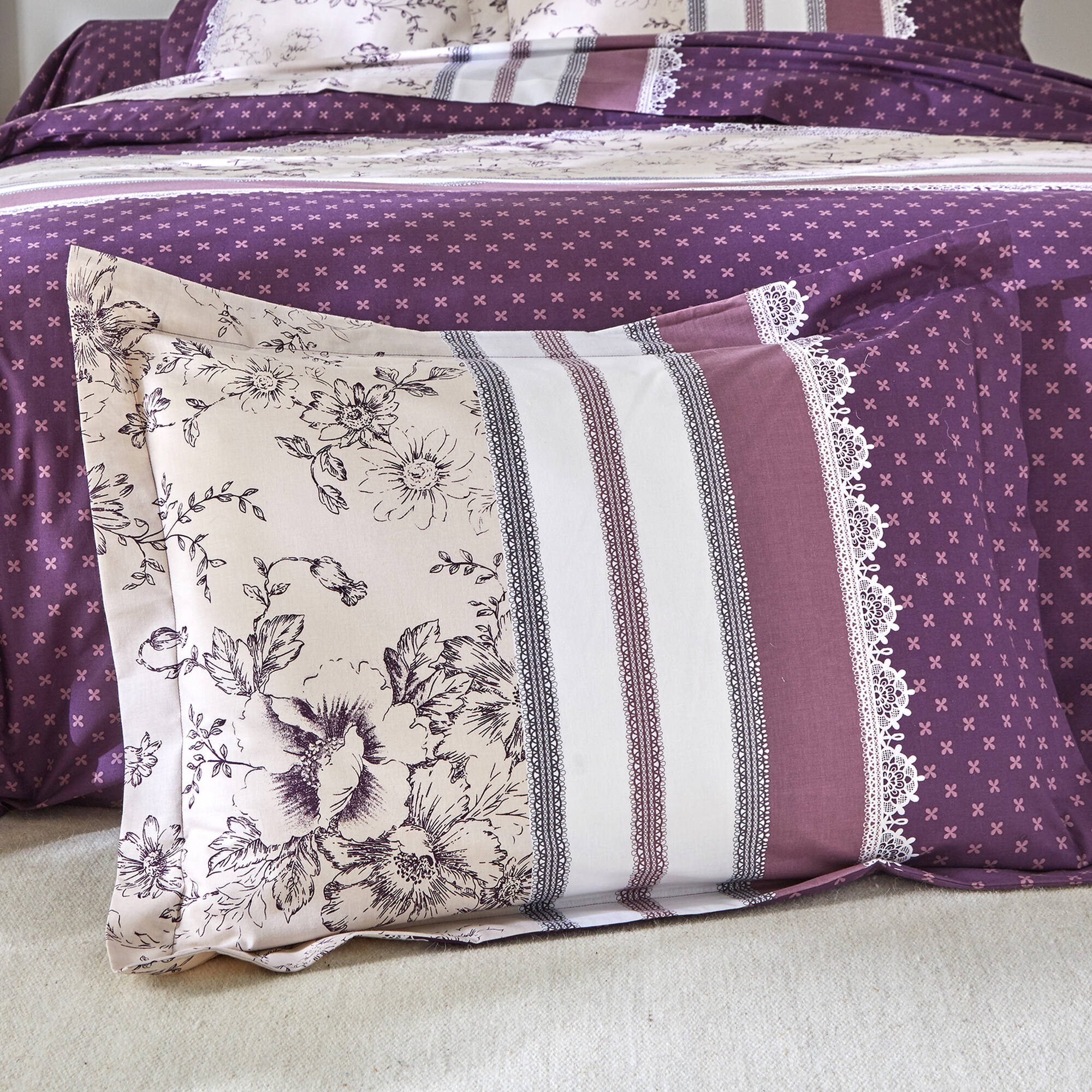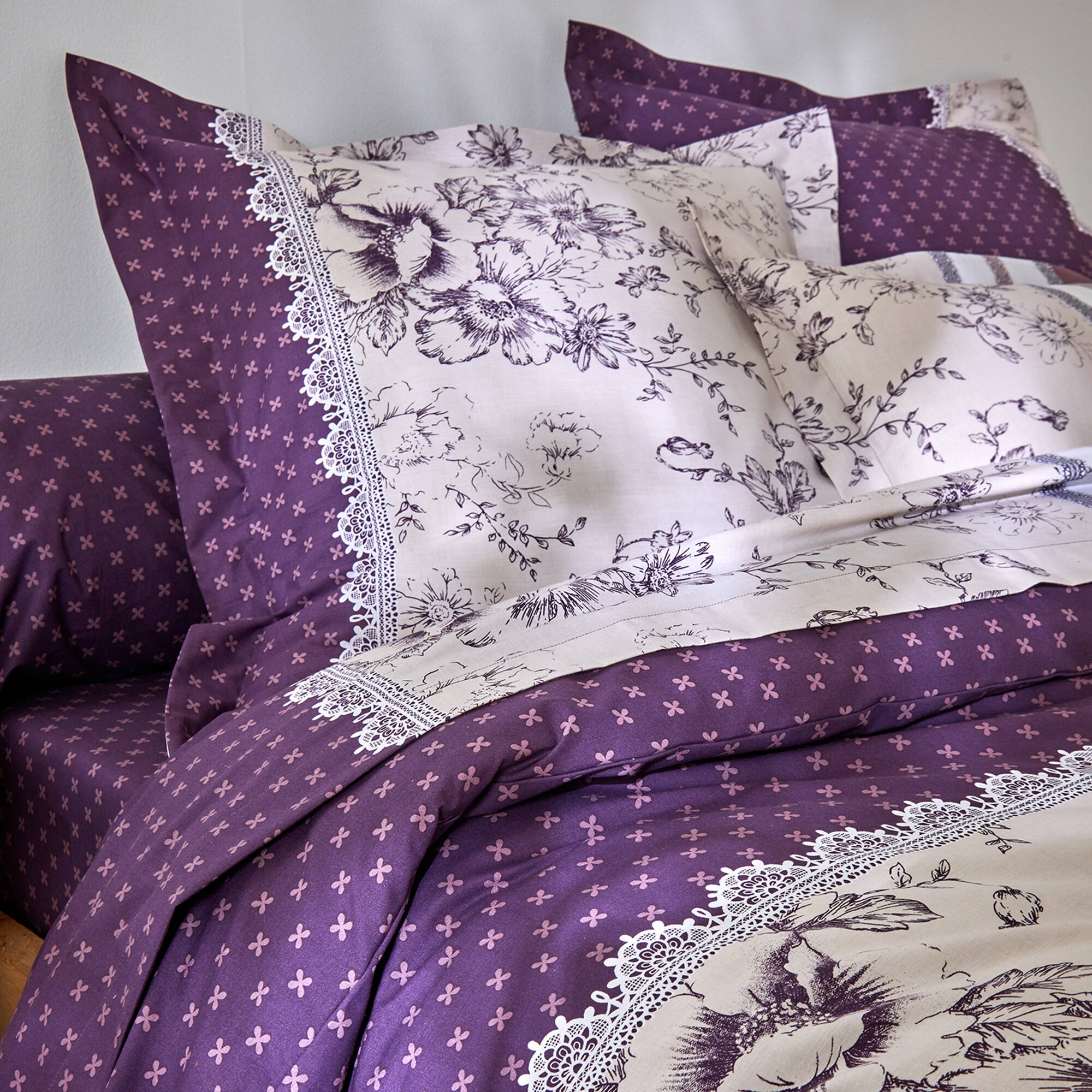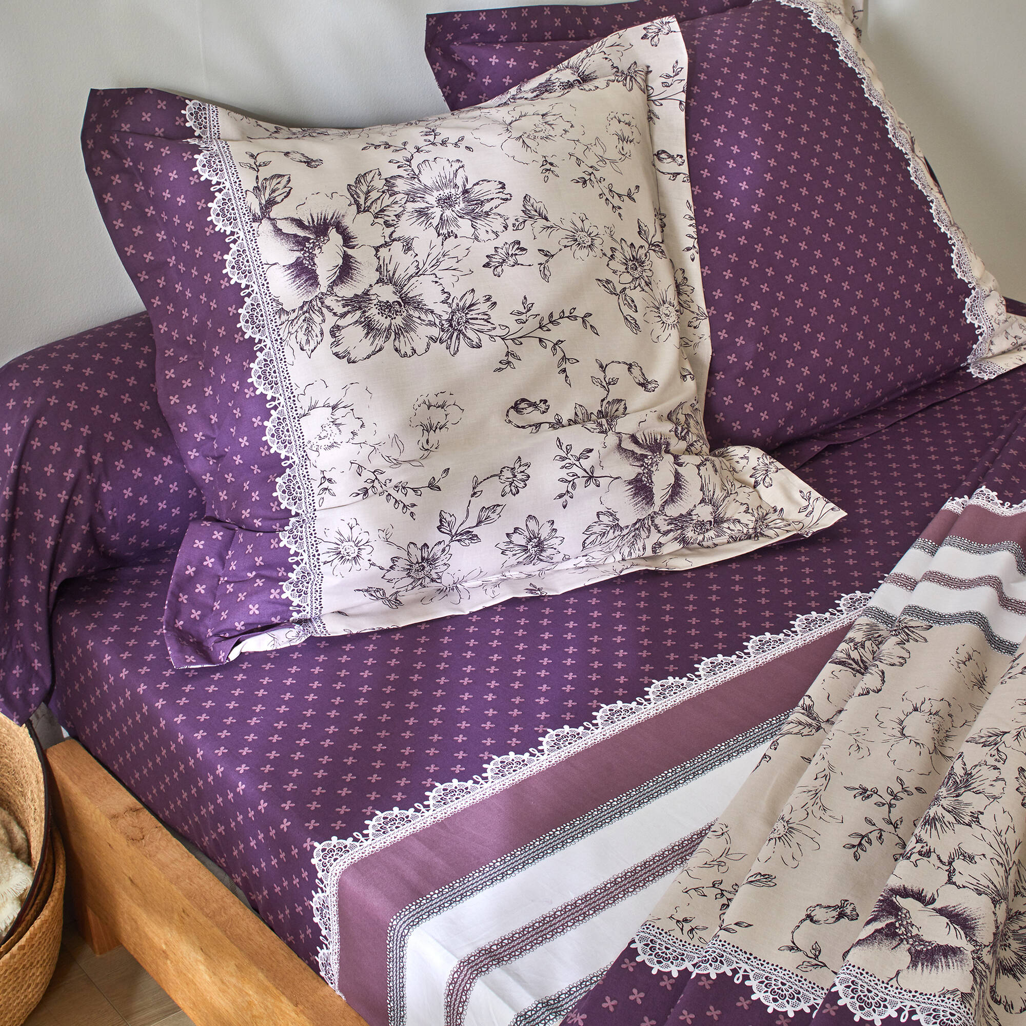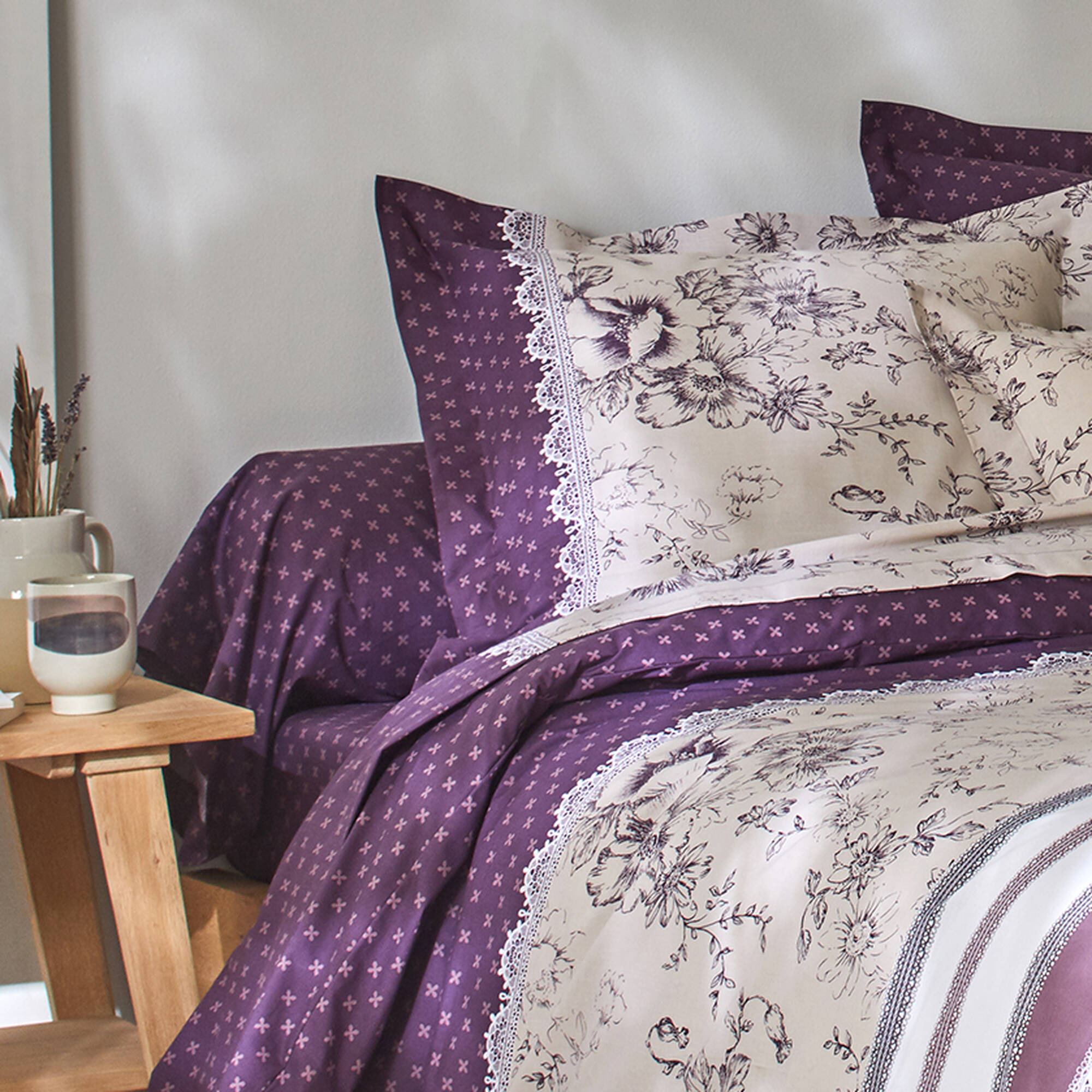 Bedlinnen Gabrielle in flanel met bloemenprint en kant (pruim)
