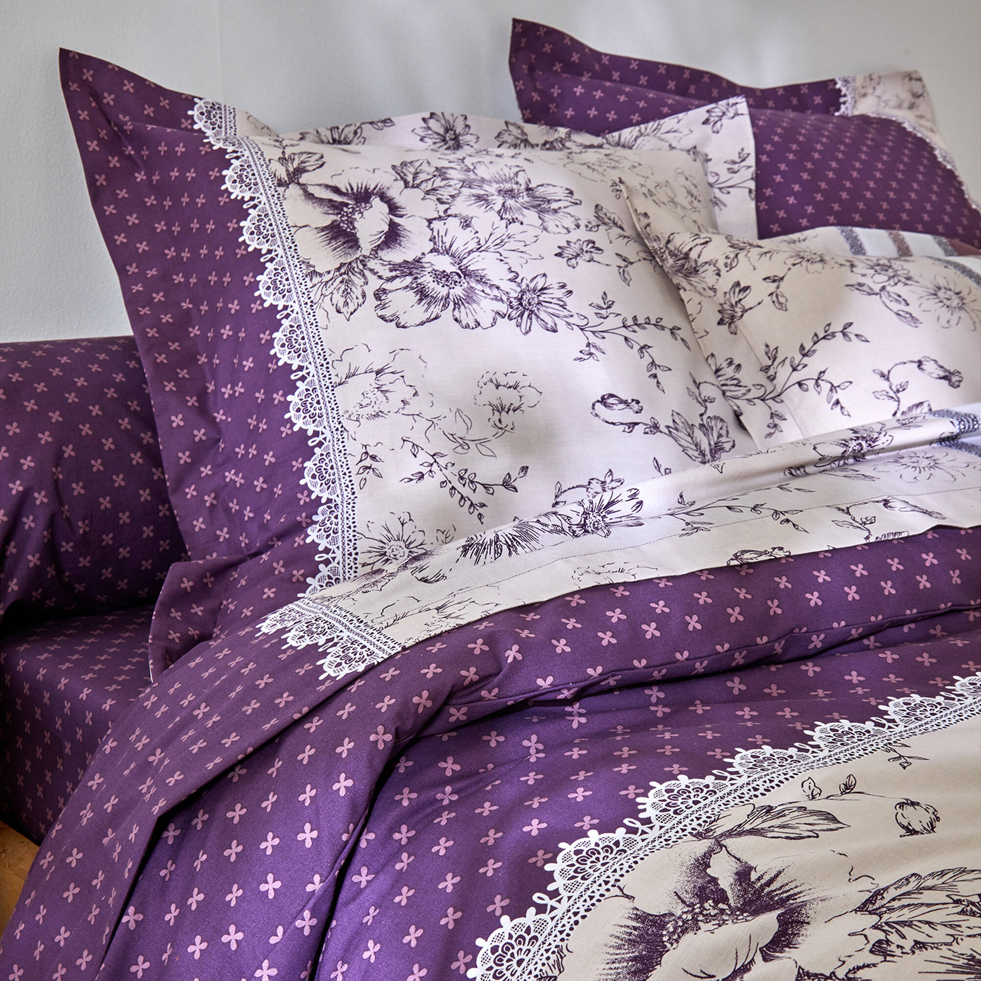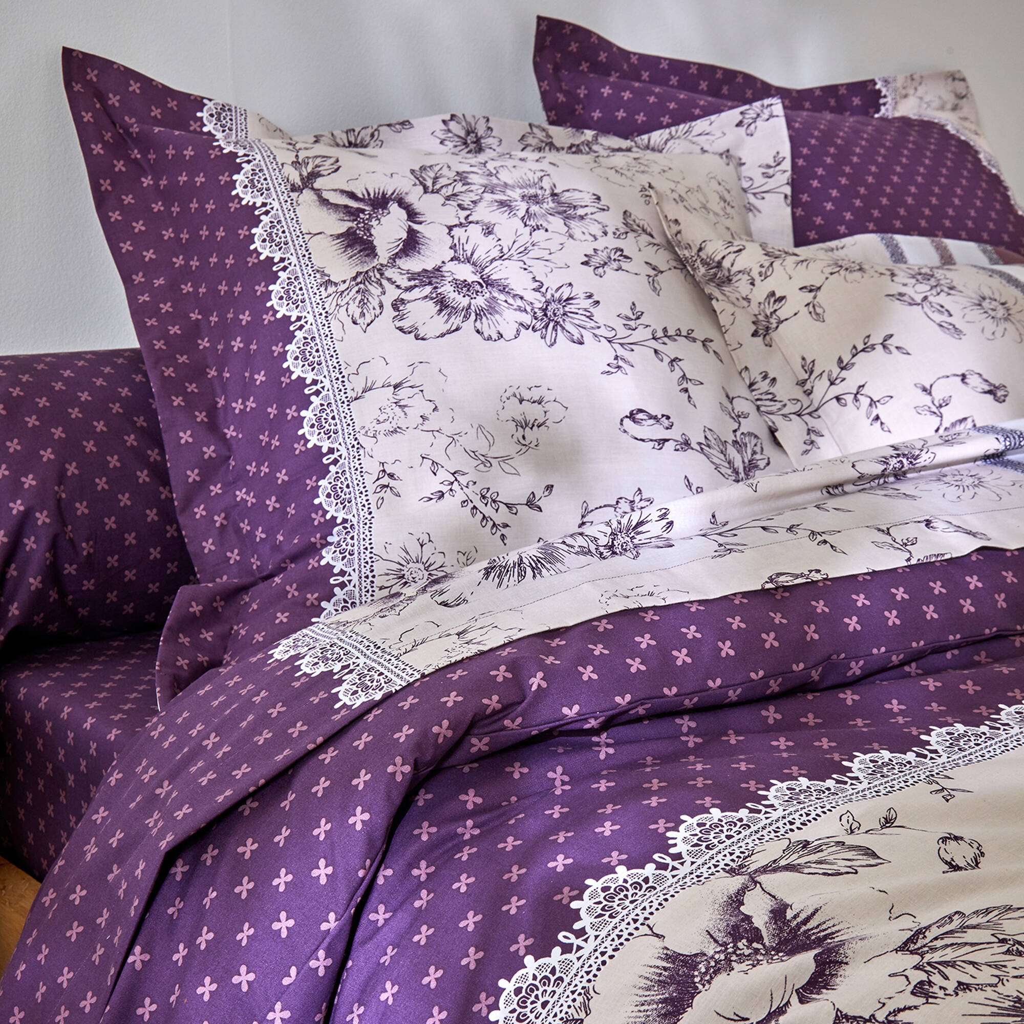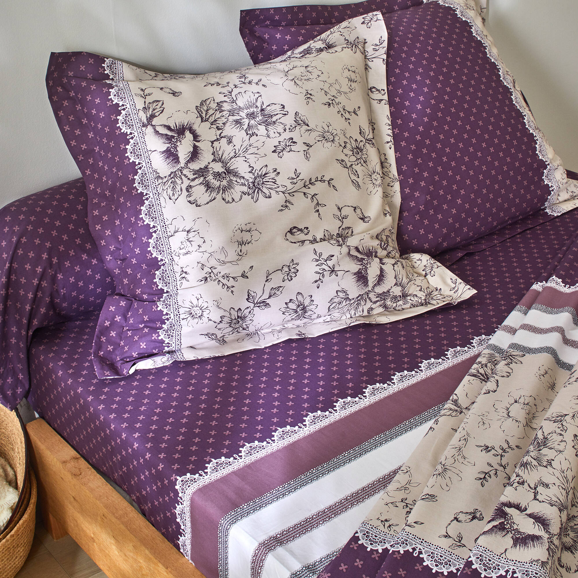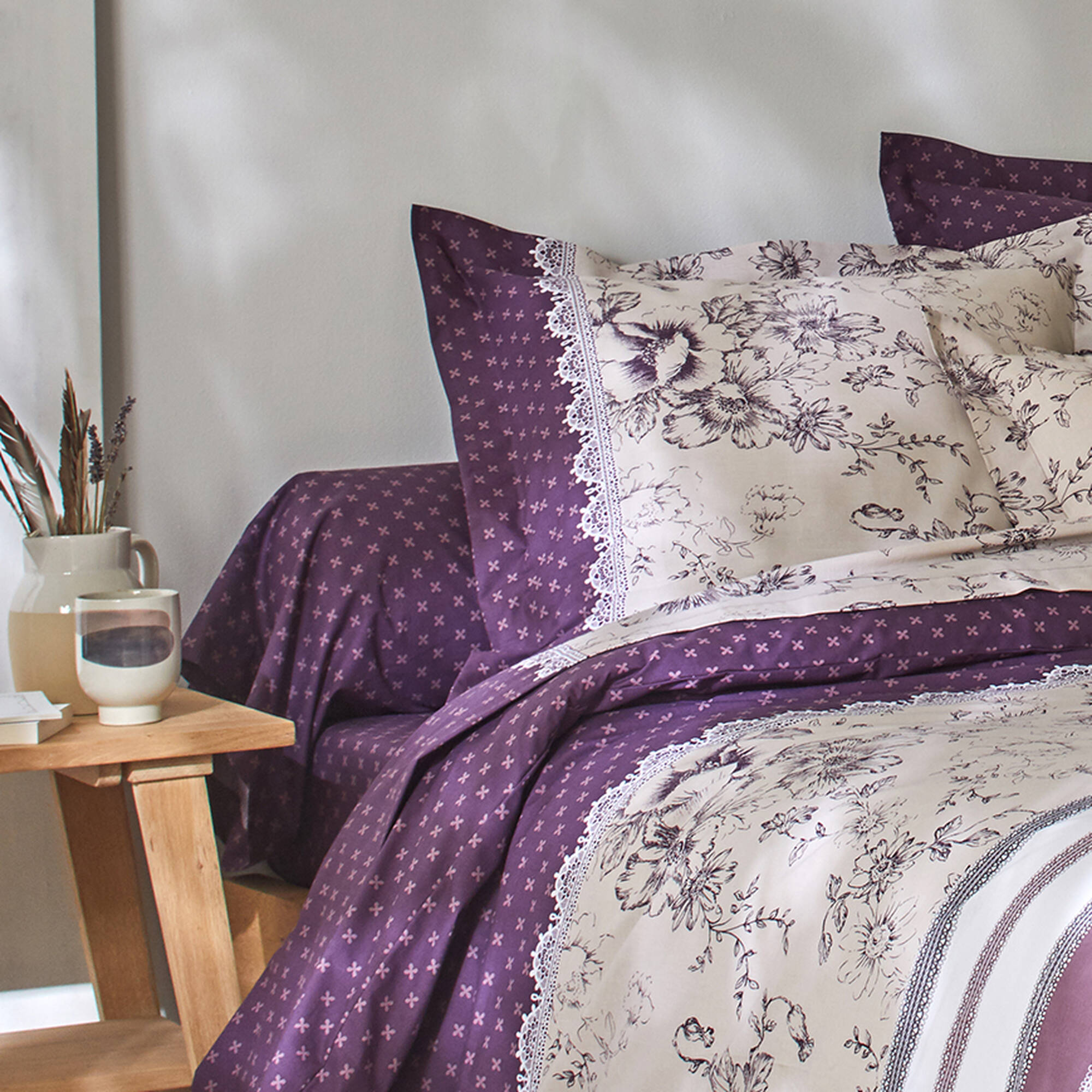 Bedlinnen Gabrielle in katoen met stippen-, bloemen- en kantprint (pruim)