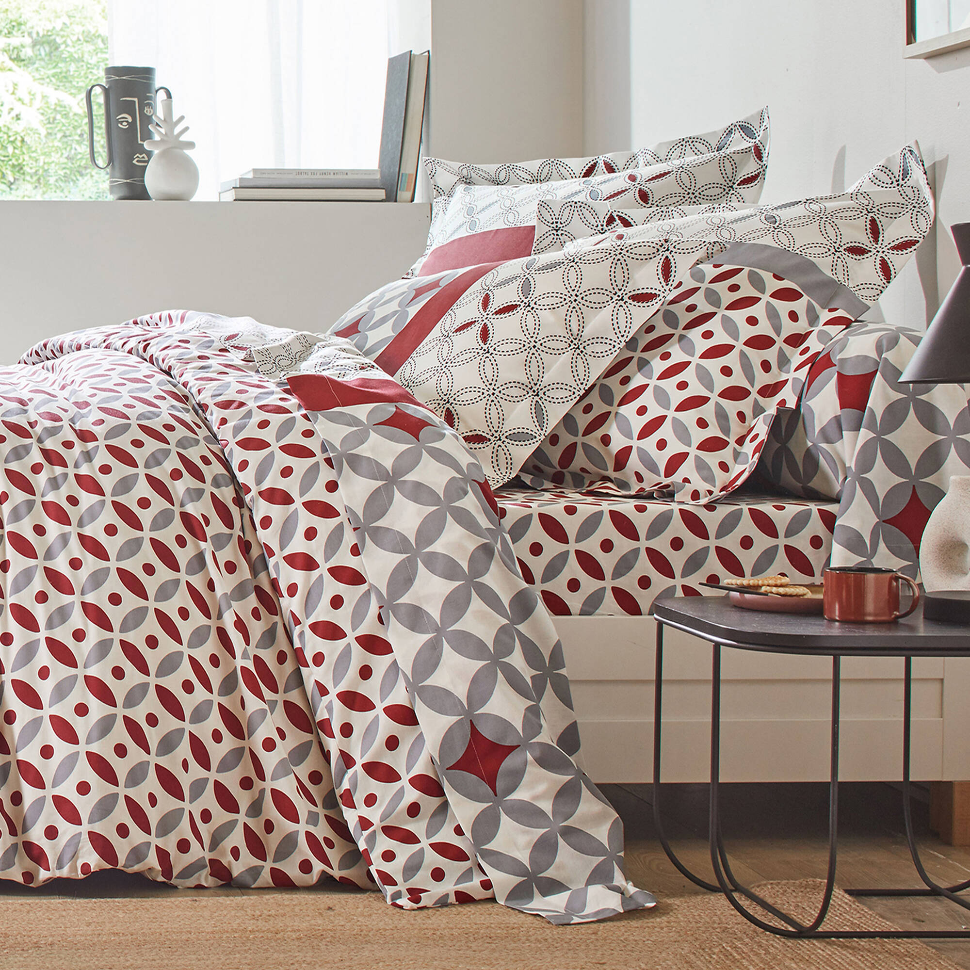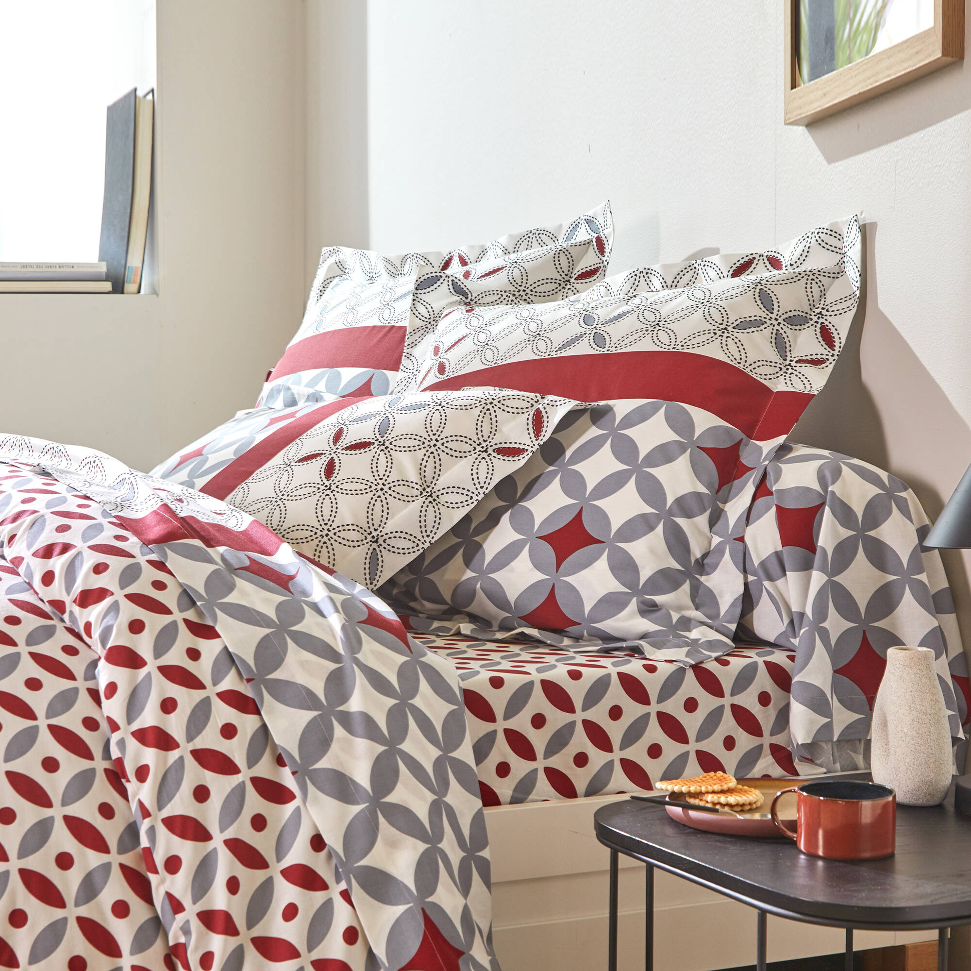 Bedlinnen Marlow, katoen met geometrische motieven (grijs / rood)