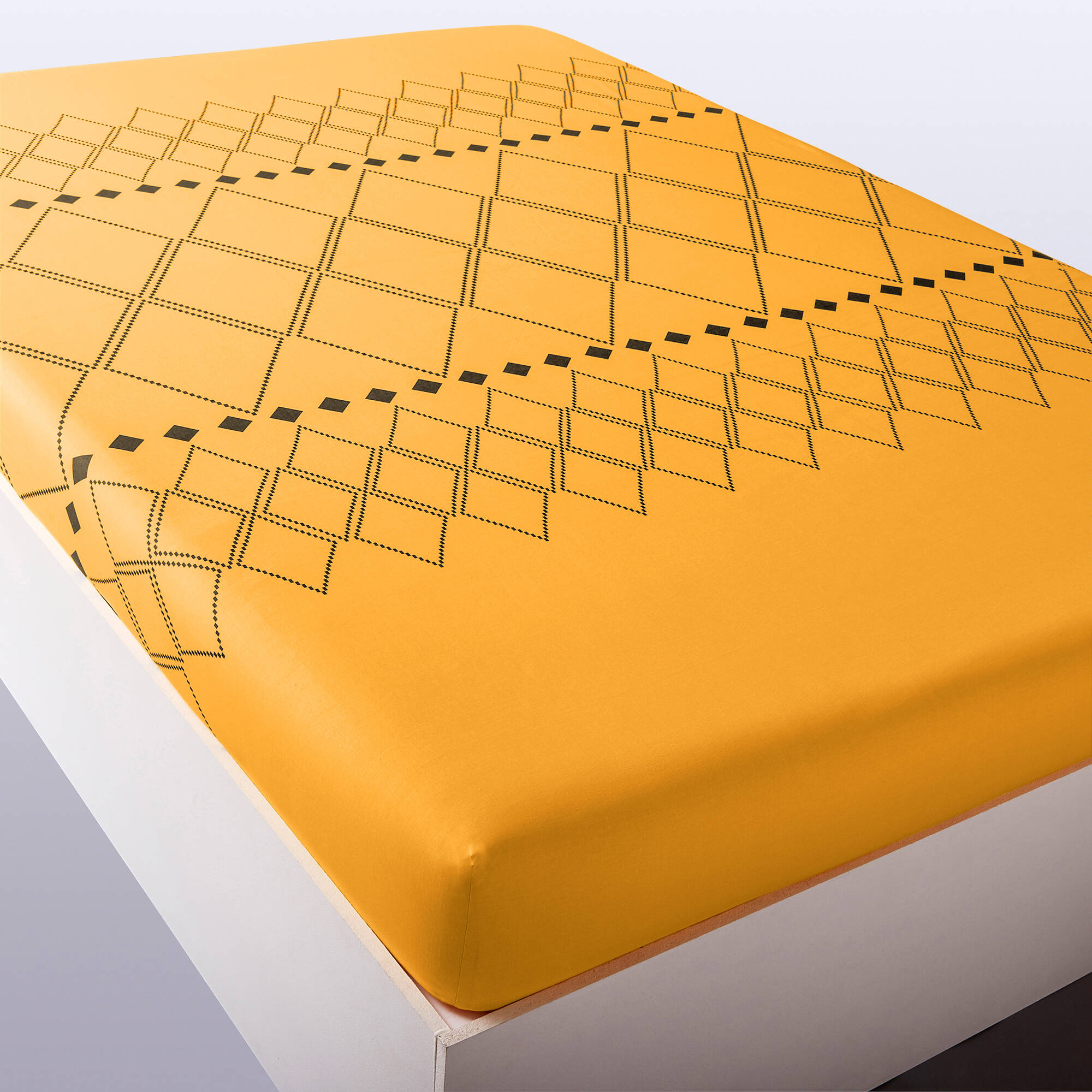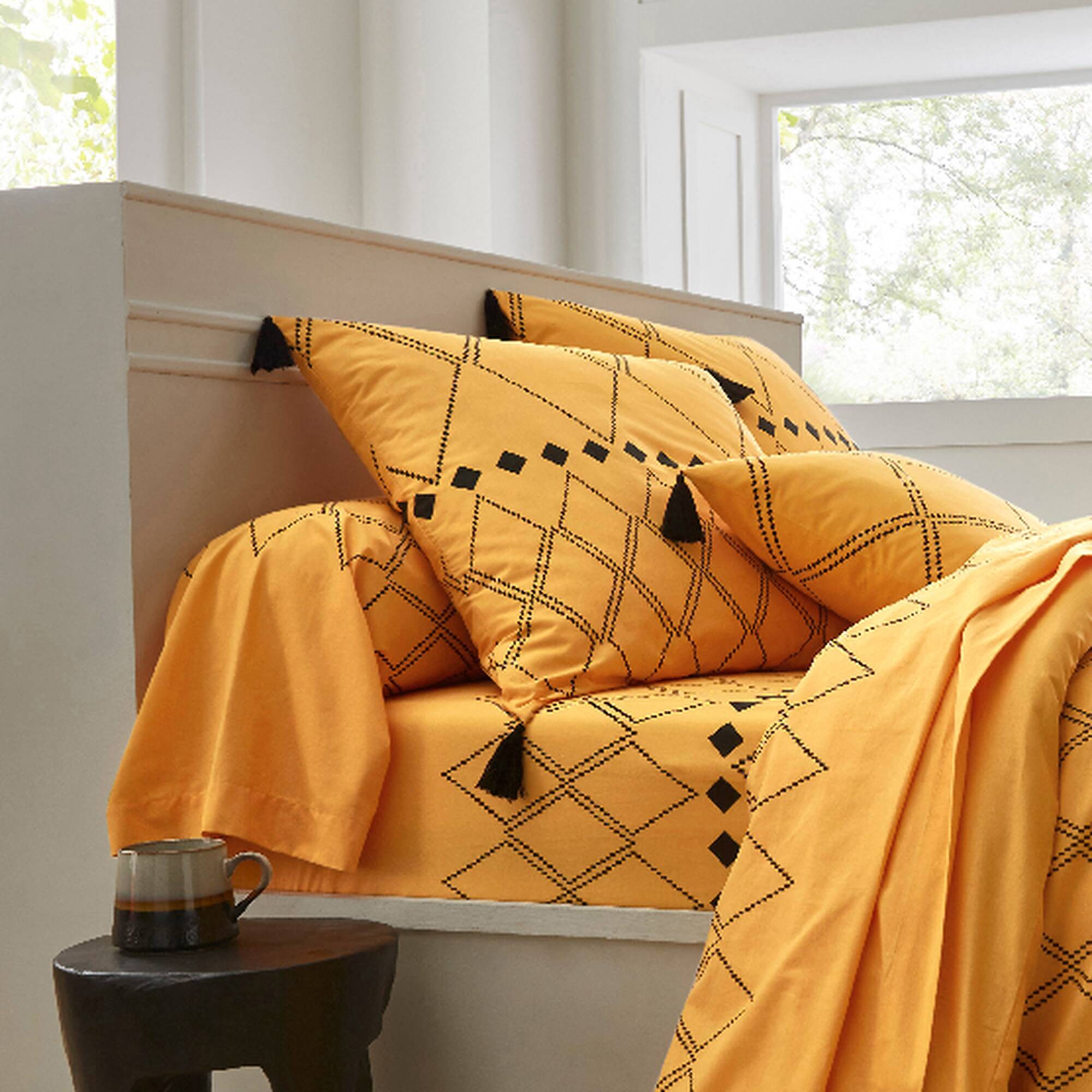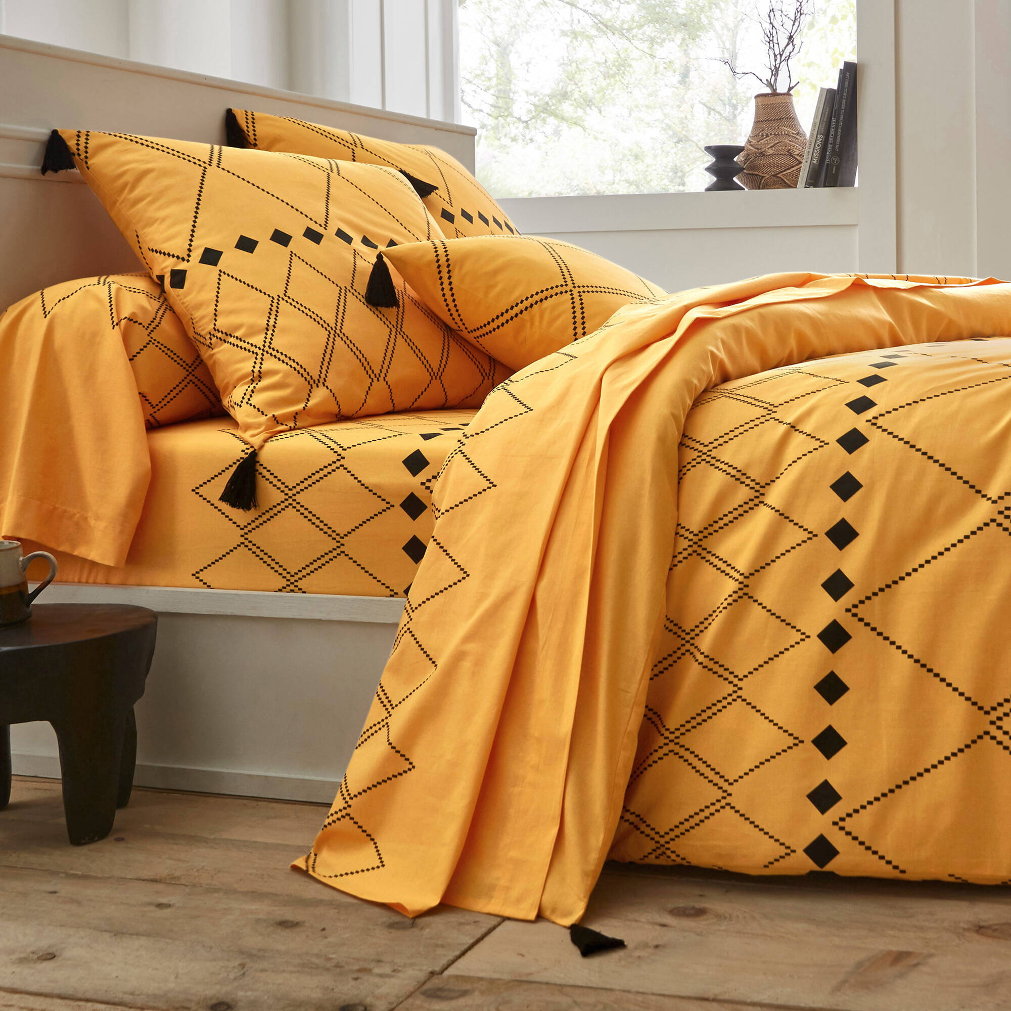Bedlinnen Massai, in katoen met grafische motieven, afgewerkt met pompons (kerrie)