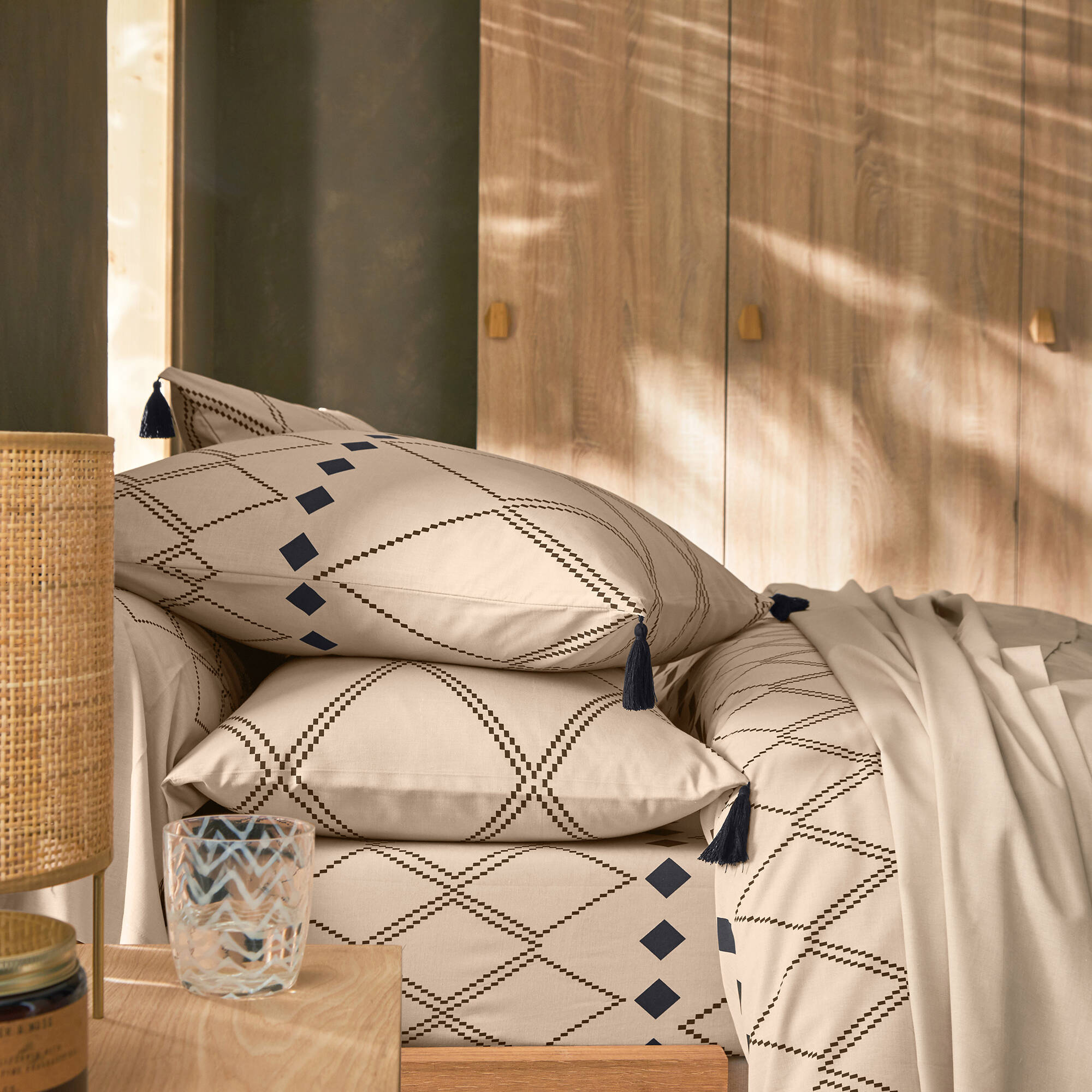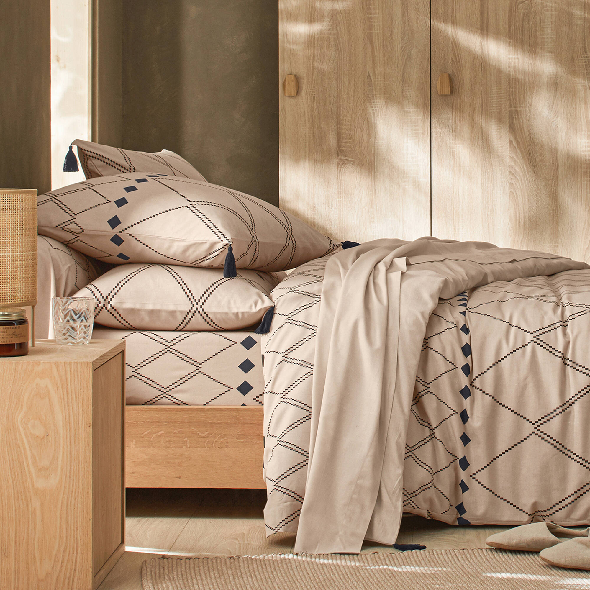 Bedlinnen Massai, in katoen met grafische motieven, afgewerkt met pompons (beige)
