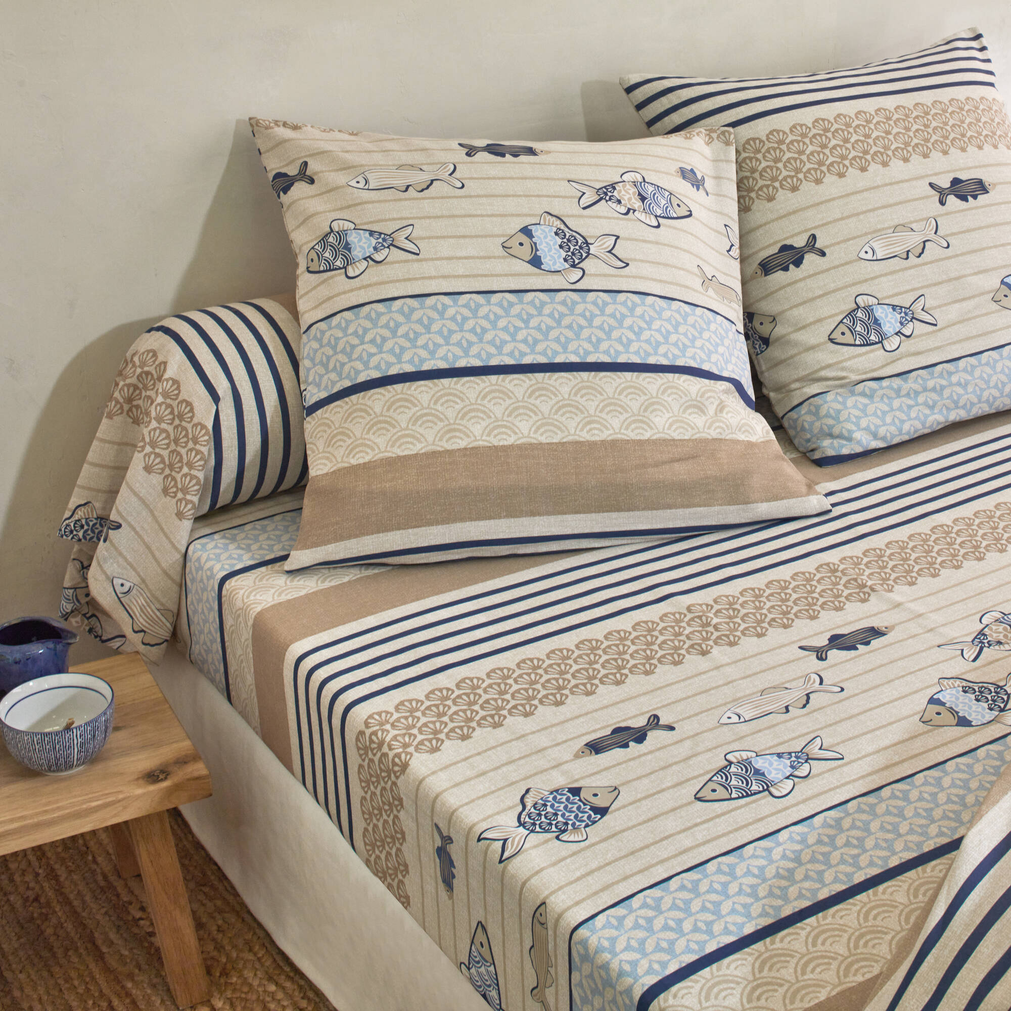 Bedlinnen Riviera in katoen met vissenprint (blauw)